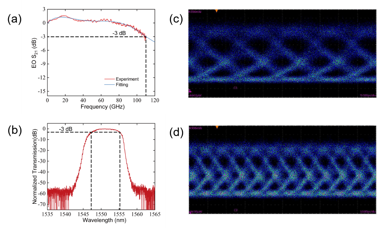 (a)电光带宽110GHz (b)光学带宽8nm (c)100Gbps OOK眼图 (d)112Gbps OOK眼图