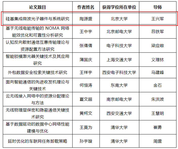 日前,中国通信学会公布了2022年度优秀博士学位论文的评选结果。按照《中国通信学会优秀学位论文评价管理办法(试行)》规定,经各高等院校、学会分支机构等单位和专家推荐,学会组织专家评价并向社会公示,最终确定10篇论文入选。中心王兴军教授指导的博士学位论文《硅基集成微波光子器件与系统研究》入选,论文作者为2022届博士毕业生陶源盛。