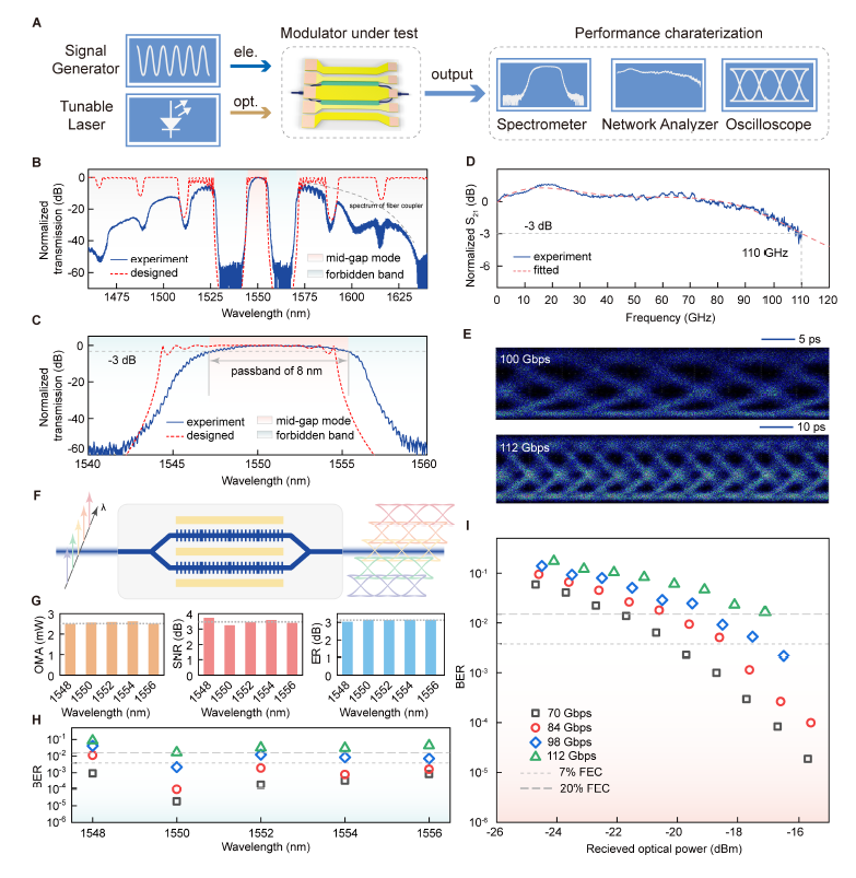 在该工作中,研究团队针对传统硅基调制器带宽受限的问题,利用硅基耦合谐振腔光波导结构引入慢光效应,构建了完整的硅基慢光调制器理论模型,通过合理调控结构参数去综合平衡光学与电学指标因素,实现对调制器性能的深度优化。研究团队基于CMOS兼容的硅基光电子标准工艺,在纯硅材料体系下设计并制备了在1550 nm左右通信波长下工作的超高带宽硅基慢光调制器,实现了110 GHz的超高电光带宽,打破了迄今为止纯硅调制器的带宽上限,并同时将调制臂尺寸缩短至百微米数量级,在无需DSP的情况下以简单的OOK调制格式实现了单通道超越110 Gbps的高速信号传输,降低了算法成本与信号延迟,同时在宽达8 nm的超大光学通带内保持多波长通信性能的高度均一性。研究团队在不引入异质材料与复杂工艺的前提下实现了硅基调制器带宽性能的飞跃,可实现低成本的晶圆级量产,展示了硅基光电子学在下一代超高速应用领域的巨大价值。