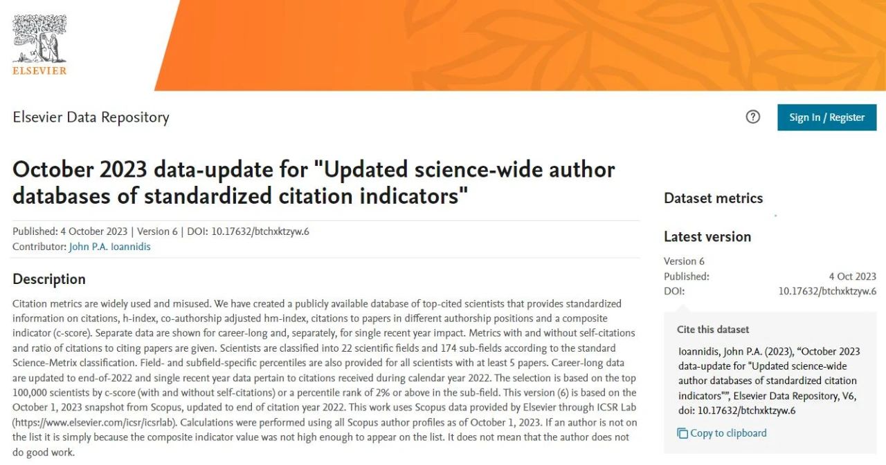 2023年10月4日,Elsevier与美国斯坦福大学John R.A. Ioannidis教授团队联合发布了“全球前2%顶尖科学家榜单(World's Top 2% Scientists)”。