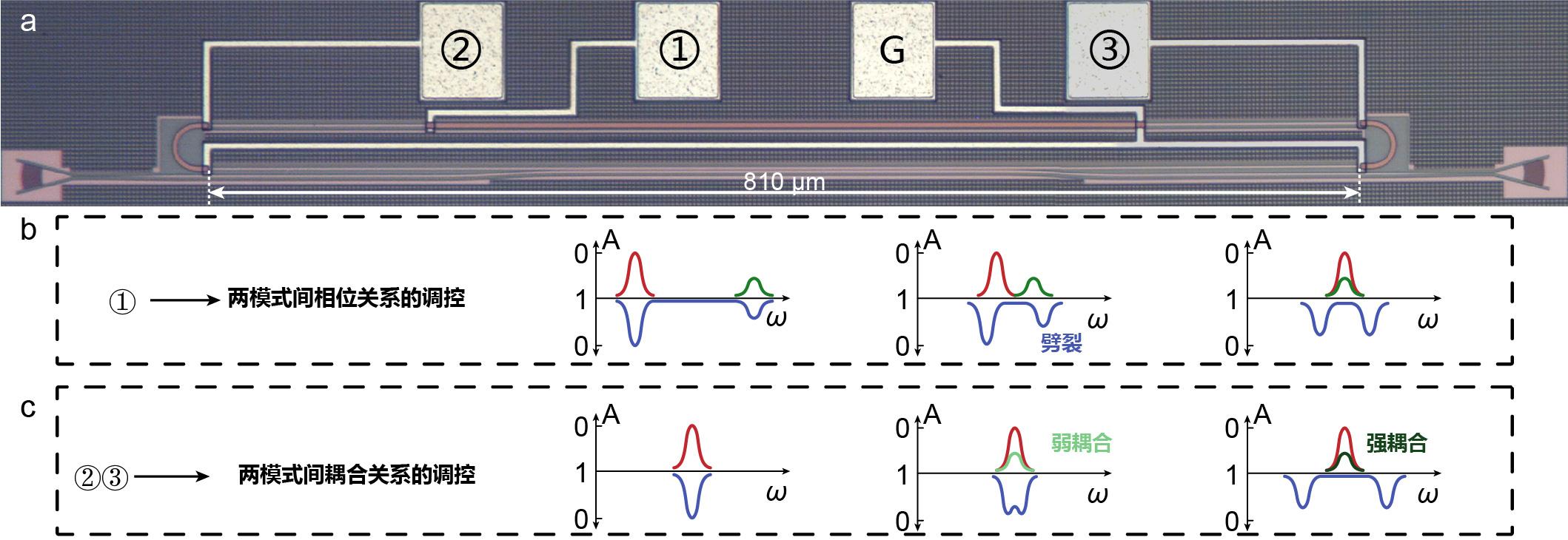 研究人员通过在微环的直波导处和弯曲波导处分别放置片上热电极,从而改变局部区域的材料折射率(如图3(a)所示)。当对直波导处的热电极①施加电压时,由于不同模式对热的响应不同,模式间的相位差将也随之改变,两个模式所形成的谐振峰在光频域会渐渐靠近,并产生劈裂现象(如图3(b)蓝线所示),当两个谐振峰频率相等时,将会产生对称的劈裂双峰。当对弯曲波导处的热电极②③施加电压时,材料折射率的变化会改变互异性点的位置,进而改变两个谐振峰的耦合强弱,产生不同频率间距的劈裂双峰(如图3(c)蓝线所示)。