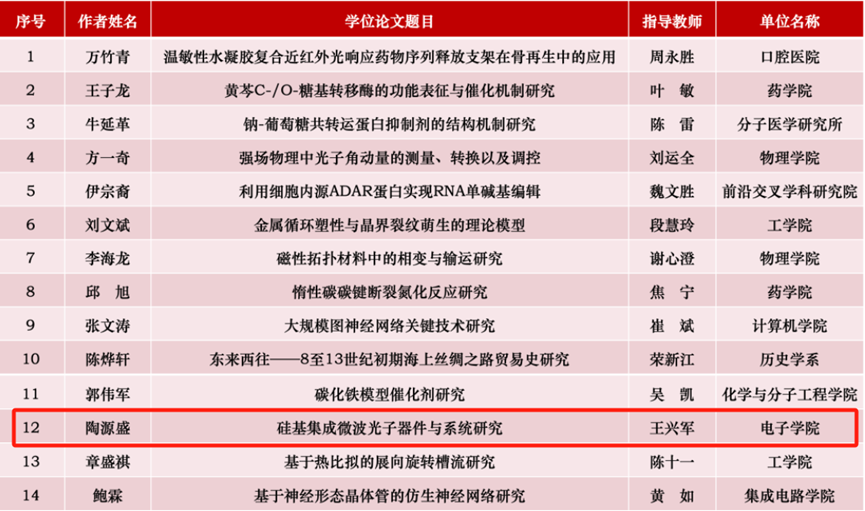 北京市教育委员会、北京市学位委员会公布了2023年北京市优秀博士学位论文名单,北京大学共14篇博士学位论文获评北京市优秀博士学位论文。中心2022届博士毕业生陶源盛的学位论文《硅基集成微波光子器件与系统研究》入选,指导教师为中心王兴军教授。