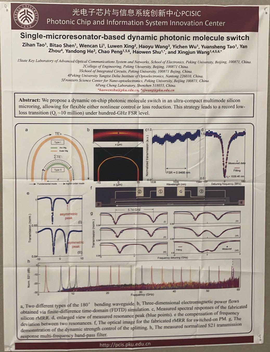 沈碧涛同学在本次会议展示了用于自注入锁定激光和微梳生成的萨格纳克环的工作,陶子涵同学在本次会议展示了基于单微谐振器的动态光子分子开关的工作。