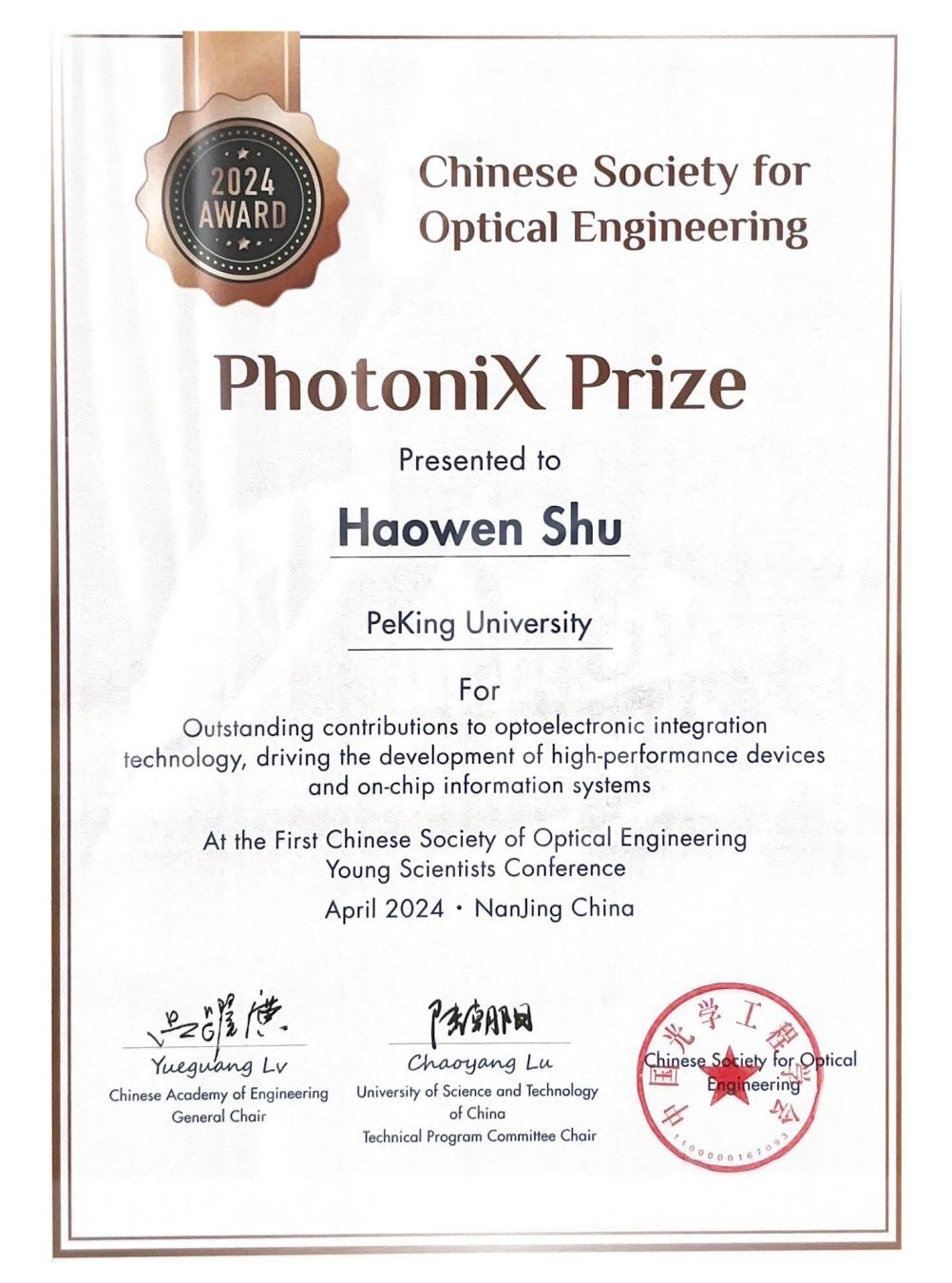 PhotoniX Prize是中国光学工程学会设立的国际奖,。学会希望通过此奖项鼓励和支持35岁以下(1989年1月1日之后出生)年轻科学家在宽泛定义的光子学及其交叉(X代表交叉)领域所做出的突出贡献,鼓励全球青年科学家追随光,靠近光,成为光,散发光。目前已有100多位国内外专家、10多位院士为该奖项推荐和提名了50多位青年科学家,本次奖项分为前沿基础奖和技术突破奖,各有3名优秀青年科学家当选。