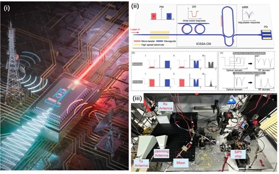 图2 (i) 微波光子滤波器芯片应用于无线通信场景的概念图。(ii) 滤波器架构与工作原理。(iii) 模拟无线场景实验