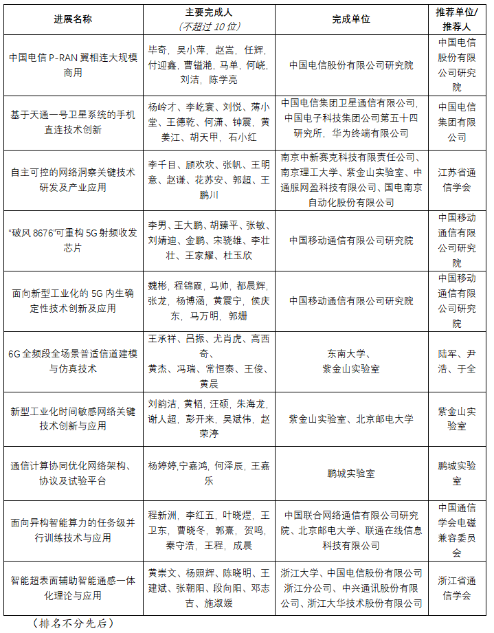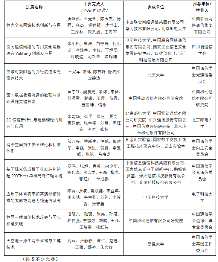 2023年度信息通信领域十大科技进展和十大科技进展提名的结果如下: