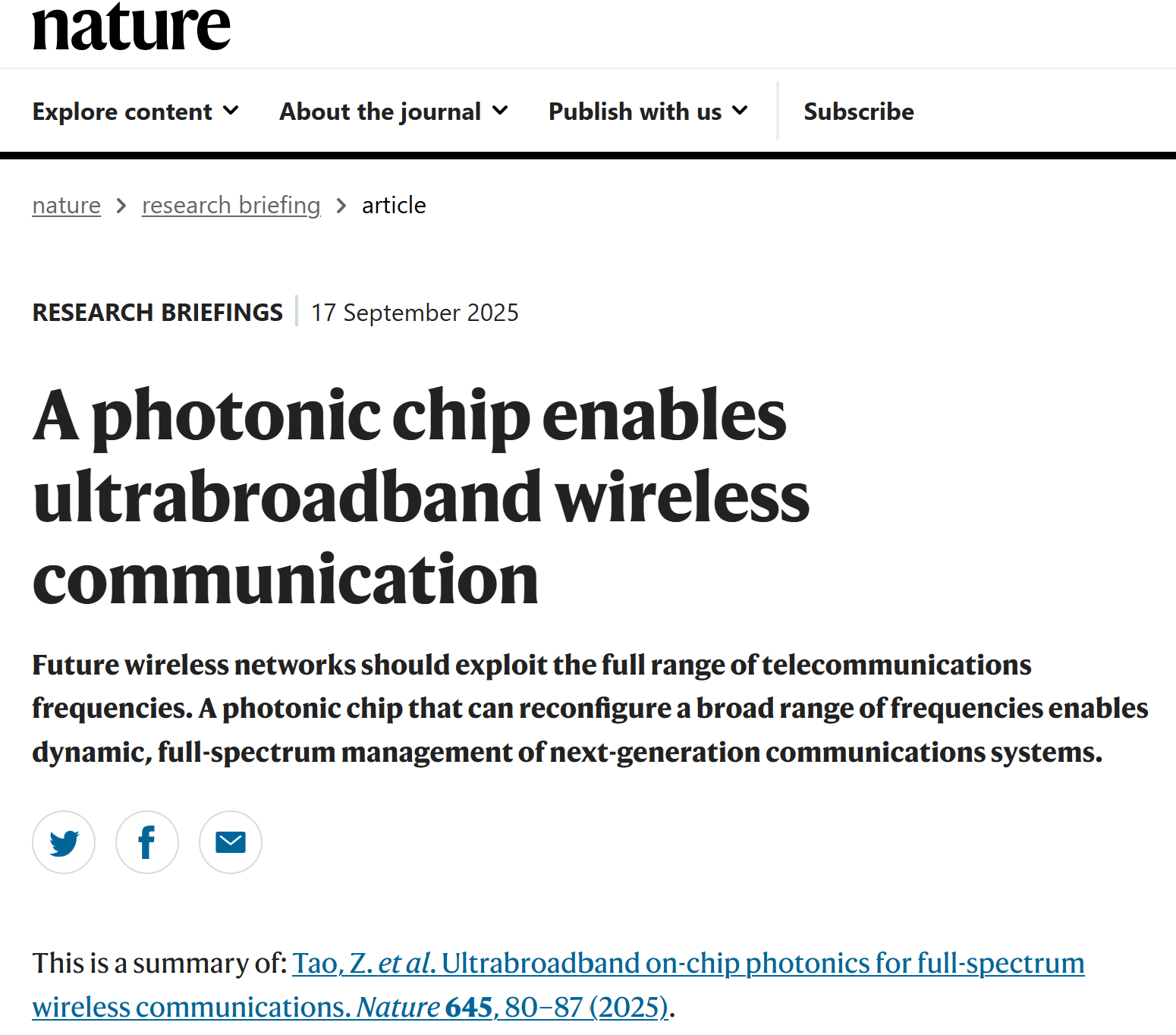 2025年9月17日,《Nature》期刊“Research Analysis”专栏以“A photonic chip enables ultrabroadband wireless communicaiton”为标题,报道了中心于8月27发表的学术成果“Ultrabroadband on-chip photonics for full-spectrum wireless communications”。本专栏每周从《Nature》中遴选3至4篇具有重大行业影响力和技术推动力的研究论文,以Research Briefing的形式进行深度采访与权威解读。