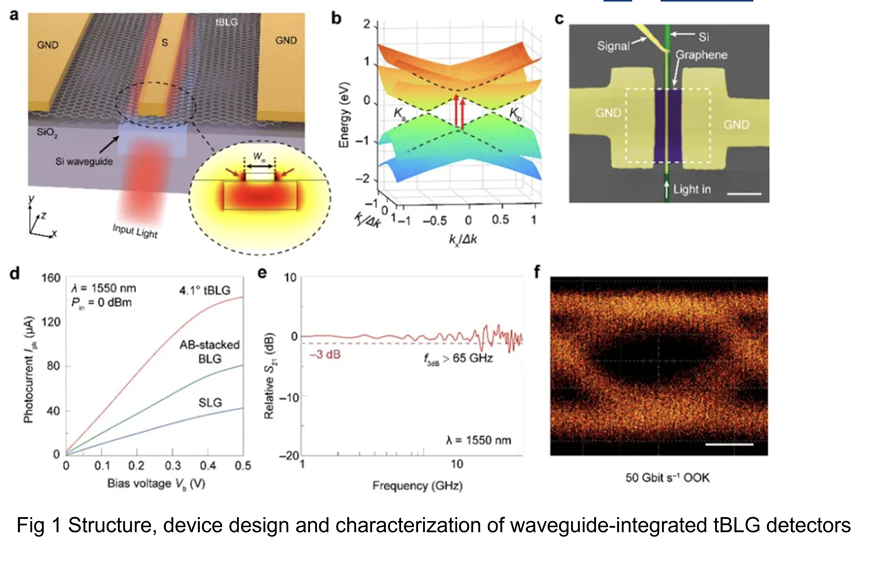 In this work, the joint R&D team integrated twisted bilayer graphene (tBLG) with silicon light. By designing the twisting angle, the energy level difference of the van Hove singularities (vHs) in the tBLG energy bands matches the energy of the photons in the 1,550 nm communication band, which significantly enhances the coupling efficiency with the light; in addition, the linear dispersion relation of the tBLG energy bands near the Dirac point gives it an ultra-high mobility close to that of the single-layer, which ensures the excellent high-frequency performance of the device. Simulation result shows that tBLG has tripled coupling efficiency compared with single-layer graphene, which can effectively shorten the channel length and improve the optical responsivity.