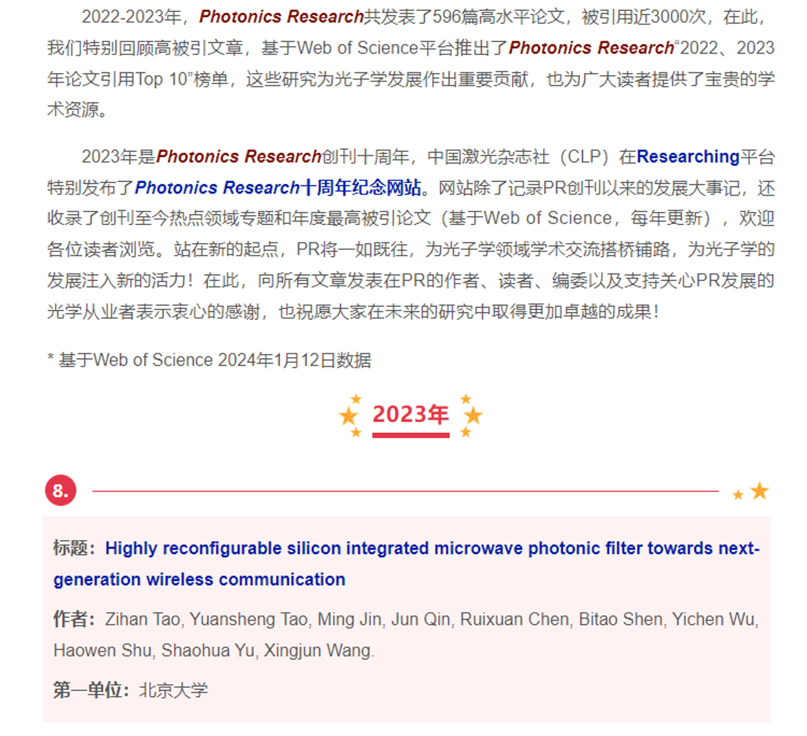 Based on the data of Web of Science on Jan. 12, 2024, the work "Highly reconfigurable silicon integrated microwave photonic filter" published in Photonics Research was selected as one of the "TOP" 10 cited papers in 2023, with Zihan Tao, a PhD student, and Yuansheng Tao, a graduated PhD student, as the co-first authors of the work. Prof. Wang Xingjun and Researcher Shu Haowen are the corresponding authors.