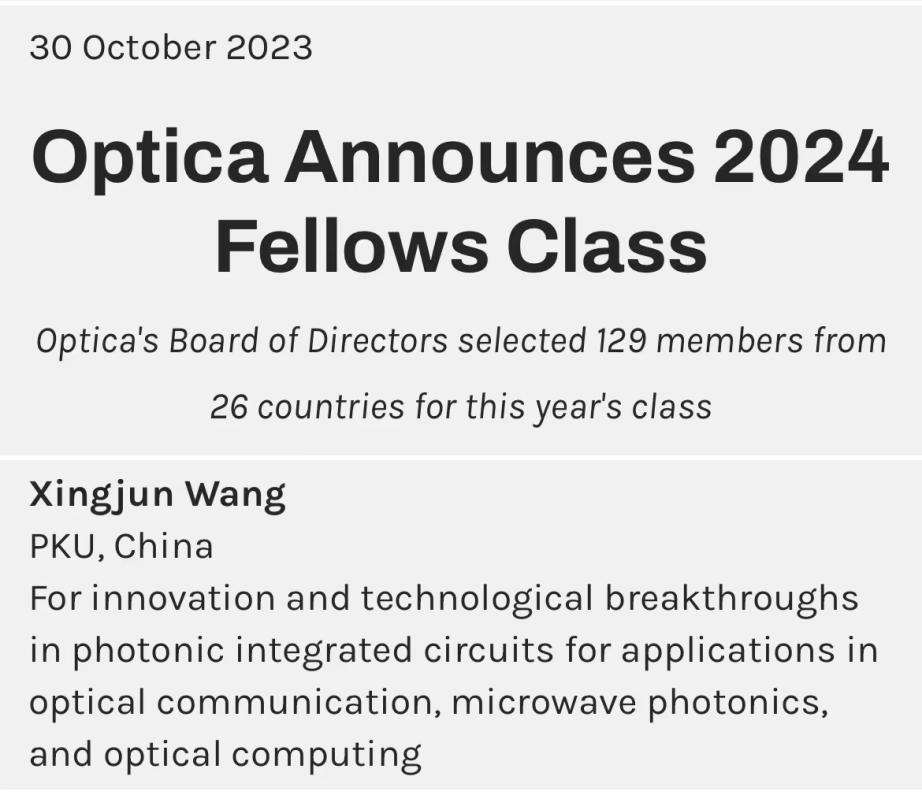 Recently, the Optical Society of America (Optica) announced the list of newly elected Fellows for the year 2024, and 129 scientists from 26 countries were newly elected as Optica Fellows. Prof. Xingjun Wang of the School of Electronics was elected as a 2024 Fellow of the Optical Society of America for innovation and technological breakthroughs in photonic integrated circuits for applications in optical communication, microwave photonics, and optical computing.