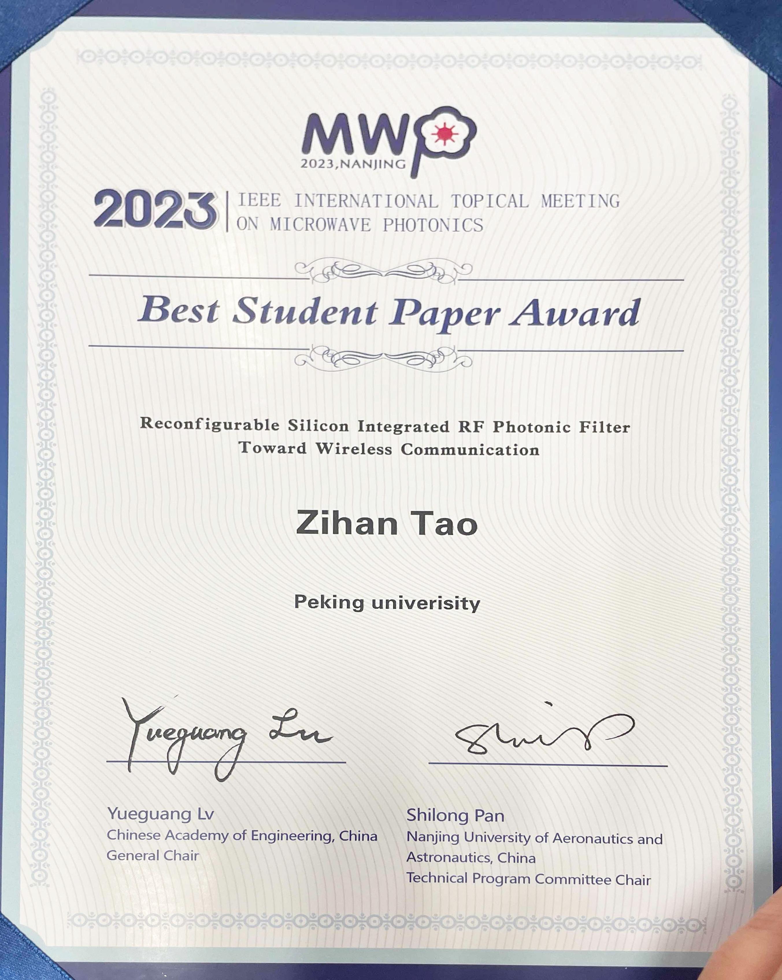 The paper "Reconfigurable Silicon Integrated RF Photonic Filter Toward Wireless Communication" written by Zihan Tao, a doctoral student under the supervision of Prof. Xingjun Wang, was honored with "Best Student Paper Award".