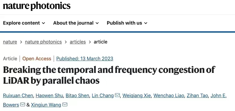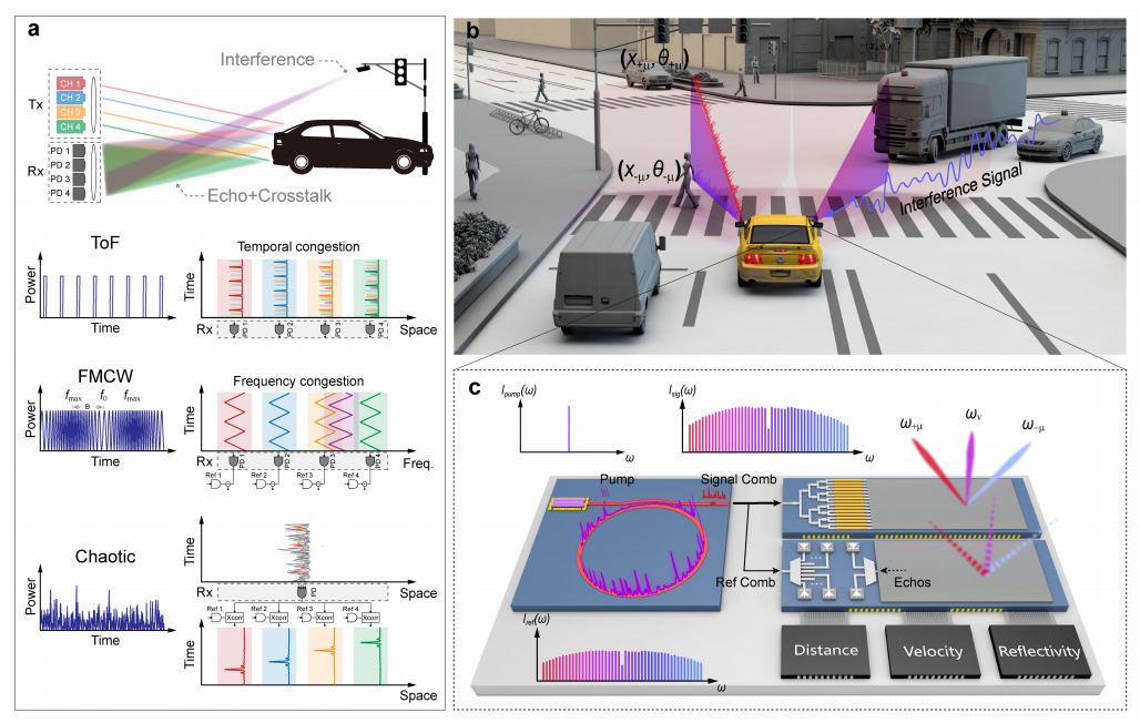 With the increasing popularity of high-level autonomous driving, LiDAR as its core device, which ensures driving comfort and safety, is receiving more and more attention. High-performance, small-size, low-cost, low-power, high-safety LiDAR is the direction that manufacturers will be competing for in the future. Based on two years of research, Professor Wang Xingjun's group - Researcher Chang Lin's group in the School of Electronics at Peking University has developed a new multi-channel chaotic light source on silicon substrate, proposed a parallel LIDAR architecture based on chaotic light comb, and overcame the two worldwide problems of LIDAR anti-jamming and high-precision parallel detection, which ensures high performance and high safety, and at the same time, greatly reduces the volume, complexity, power consumption and cost of future LIDAR systems.