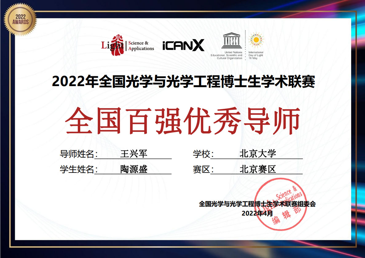 Congratulations to Prof. Xingjun Wang of the Center for receiving the 2022 National Top 100 Outstanding Tutor Award in the National Optics and Optical Engineering Doctoral Academic League.