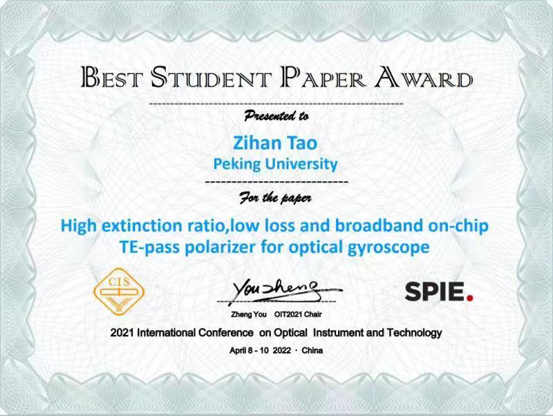 Under the supervision of Prof. Xingjun Wang, Zihan Tao, a PhD student of the Center, gave an online oral presentation on the topic of "High extinction ratio, low loss and broadband on-chip TE-pass polarizer for optical gyroscope". After the selection, Tao Zihan's paper won the "Outstanding Student Paper Award". It is reported that the conference included 108 papers in 8 topics, of which 17 papers won this honor.