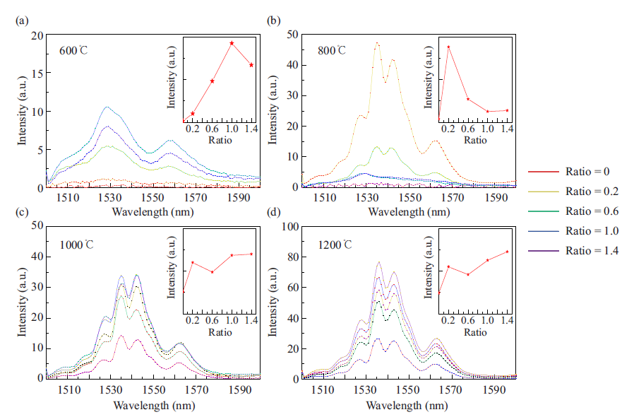 Fig. 1 Photoluminescence (PL) spectra of bismuth oxide and erbium-ytterbium silicate hybrid thin films at different annealing temperatures and doping ratios