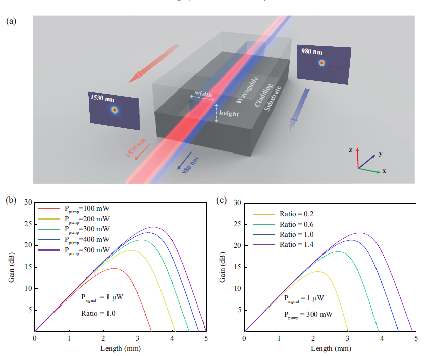 Fig. 2 (a) On-chip waveguide amplifier structure; (b) and (c) gain-transmission curves at different concentration ratios, pump optical power, and signal optical power