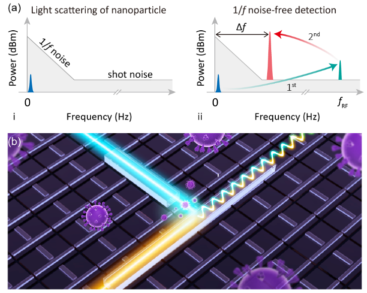Fig. 1 (a) 1/f noise suppression mechanism; (b) single-particle detection based on on-chip waveguide dark-field heterodyne interferometry