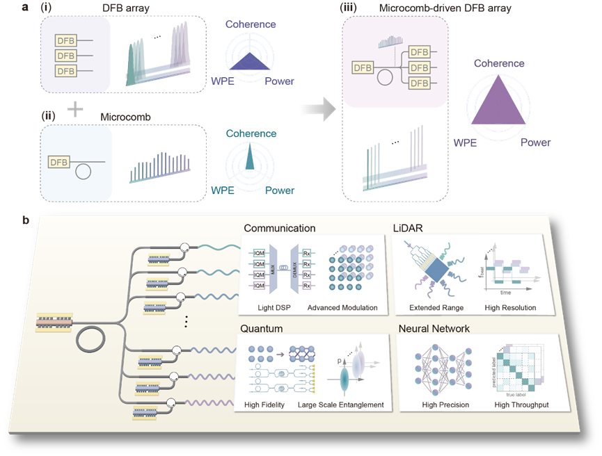 In this work, the research team demonstrated a low-cost method for achieving highly coherent and parallelized light sources in integrated optics, thereby overcoming the aforementioned challenges. Unlike improving the efficiency of coherent light sources themselves, this technique uses a highly coherent self-injection-locked optical frequency comb as a seed light to injection-lock DFB lasers. Through theoretical analysis and experimental validation, the approach effectively combines the advantages of microcavity optical frequency combs and DFB lasers, successfully achieving light sources with high coherence, high power, and high wall-plug efficiency (WPE).