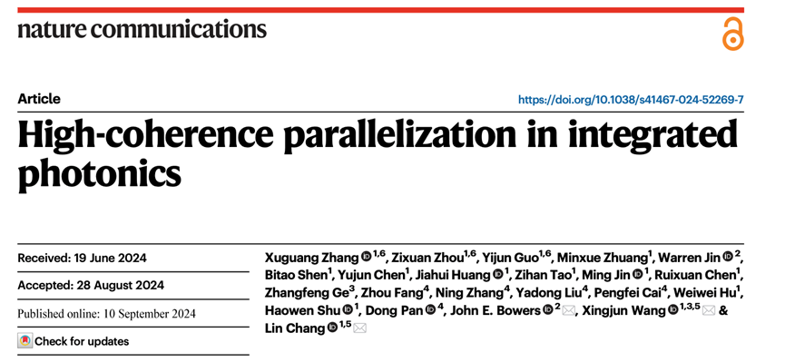 On September 10, 2024, the Center team, in collaboration with Chang Lin's team at the School of Electronics, published the research article "High-coherence parallelization in integrated photonics" online in Nature Communications. This study demonstrates a novel low-cost, highly coherent integrated parallel source generation scheme. By combining a self-injection-locked optical frequency comb and an array of injection-locked lasers, a record on-chip 60 dB gain at near-zero noise figure is achieved. In addition, by combining this technology with silicon optical coherent modules, a total data rate of more than 60 Tbit/s is achieved and phase-dependent digital signal processing (DSP) overhead is reduced by 99.99999 percent. This research paves the way for the realization of large-scale, high-performance, high-capacity coherent optical systems, which are expected to solve the inter-chip and inter-data-centre interconnection problems brought about by the explosive growth in traffic demand, and bring new hope for the development of future optical communication networks.